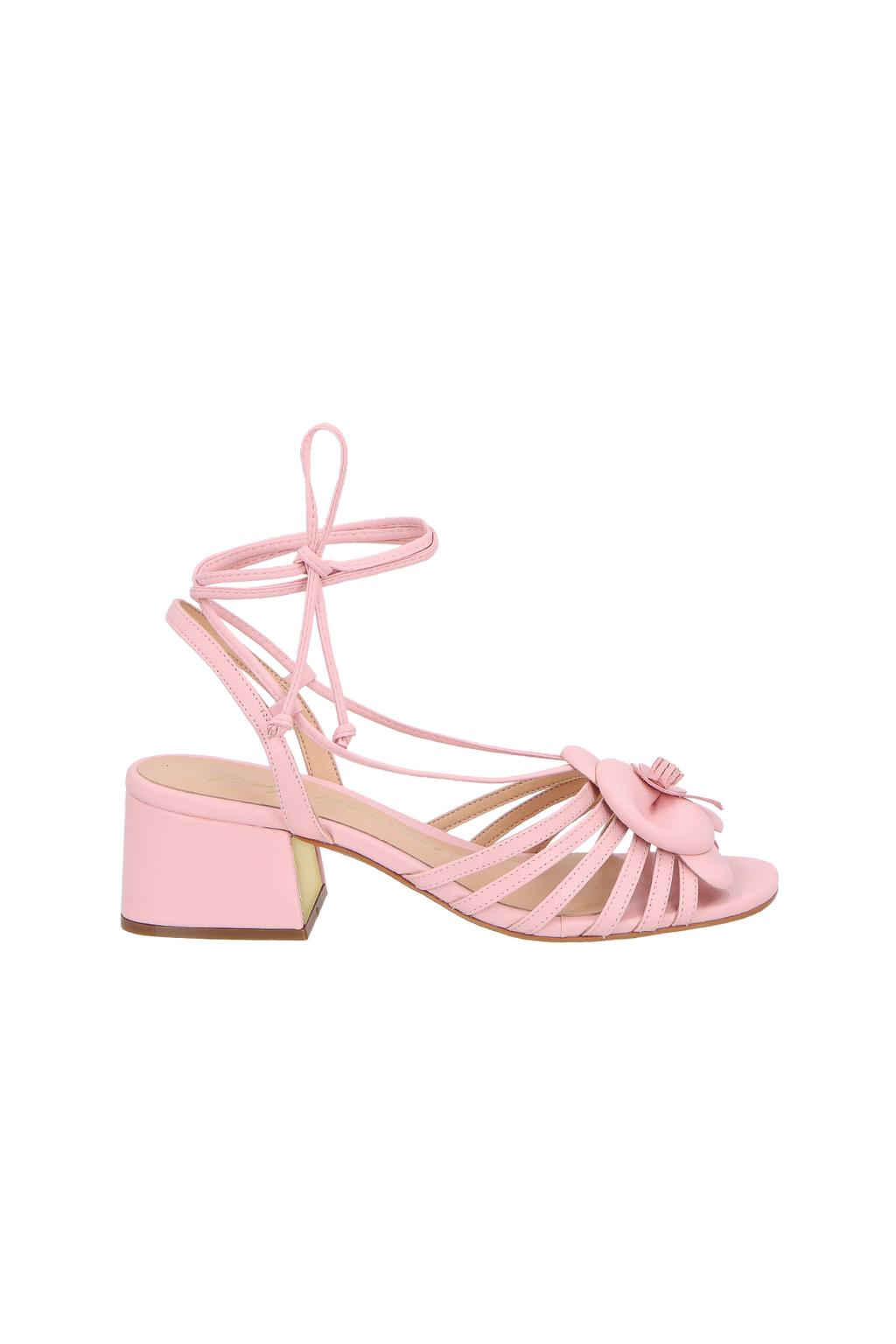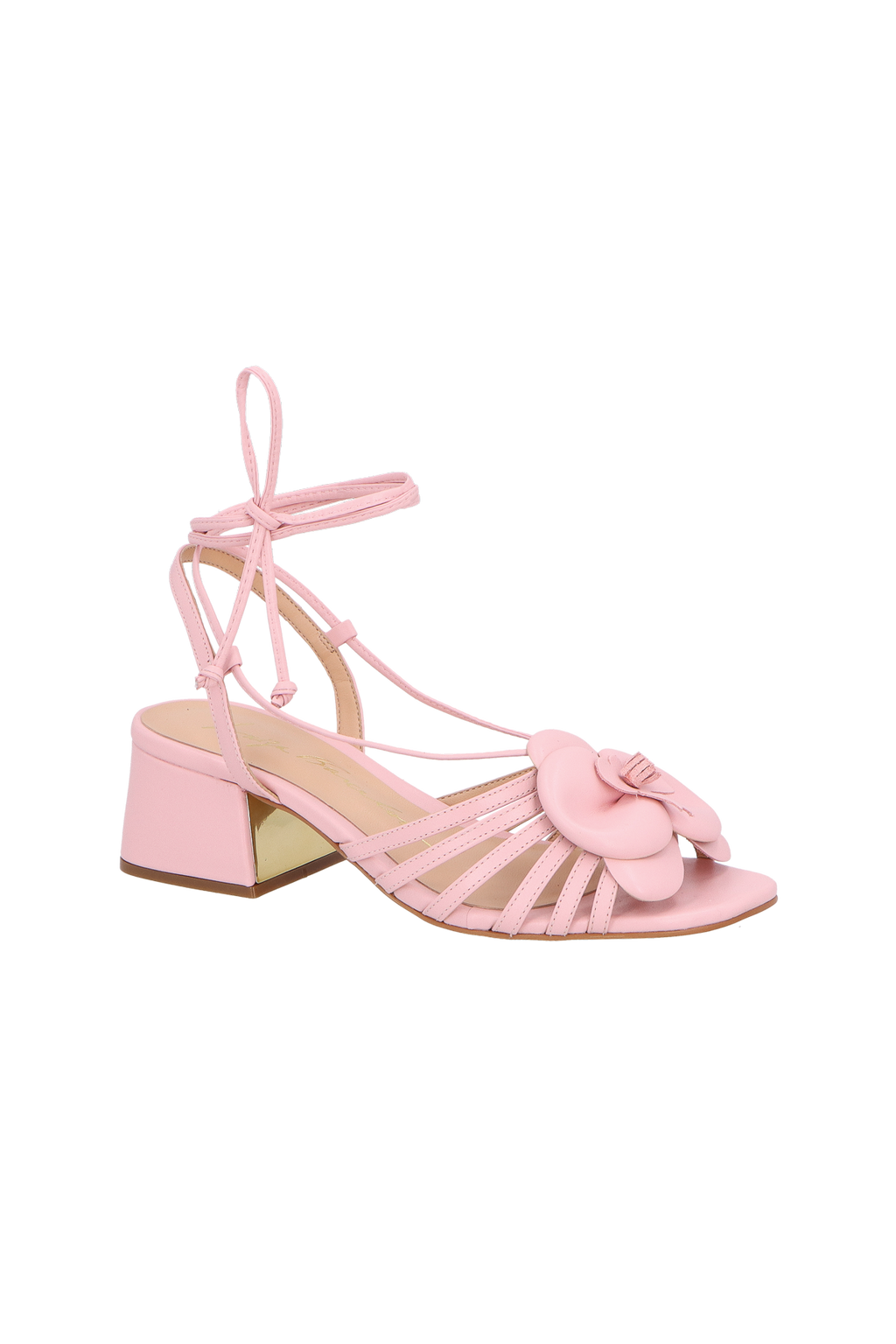 Sandália em couro rosa glacê que combina romantismo e modernidade. O destaque fica por conta da aplicação de flor estruturada na gáspea, enquanto as tiras delicadas e a amarração no tornozelo conferem leveza ao design. O salto bloco baixo com detalhe metalizado adiciona sofisticação, garantindo charme e conforto em cada passo.