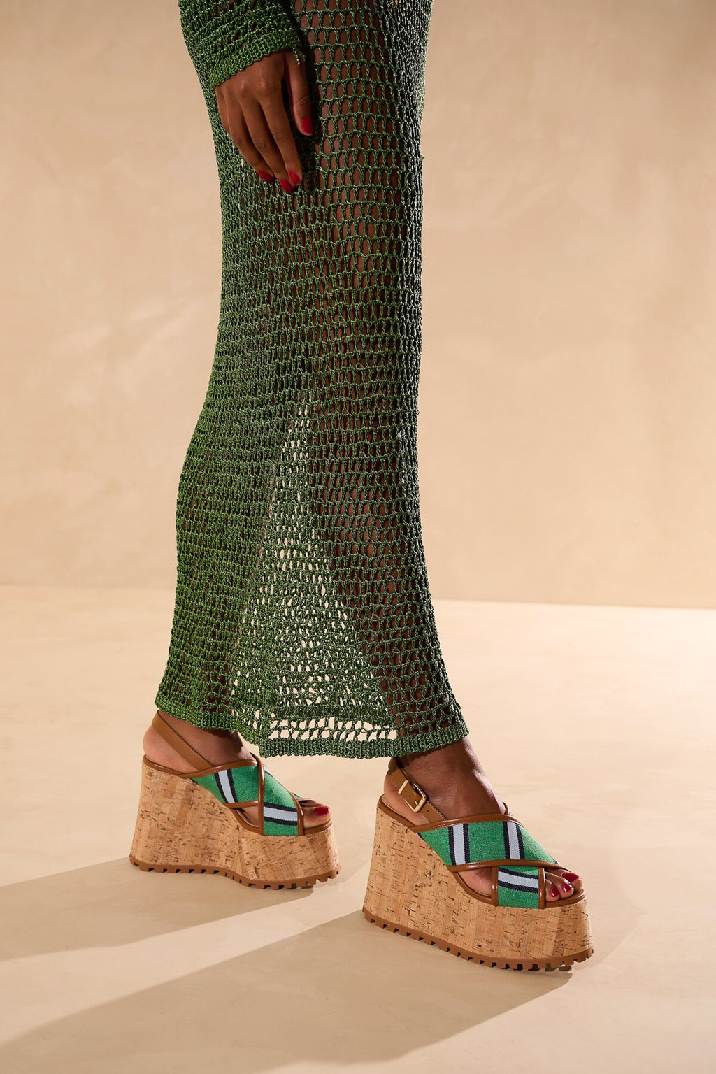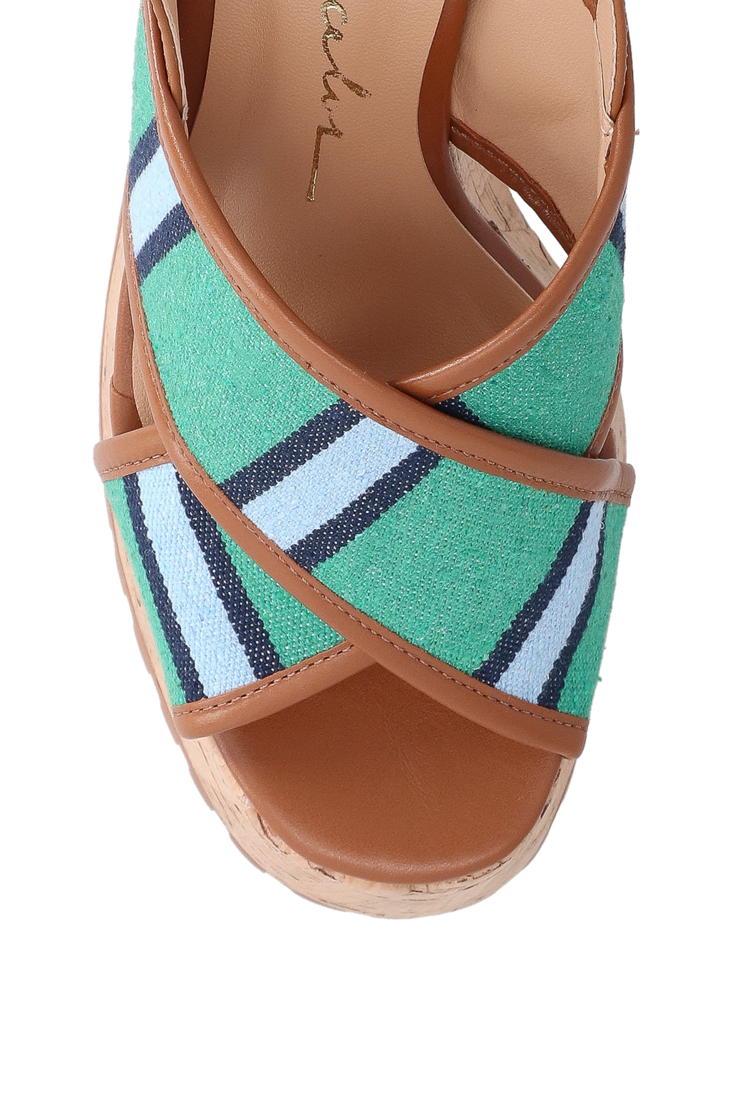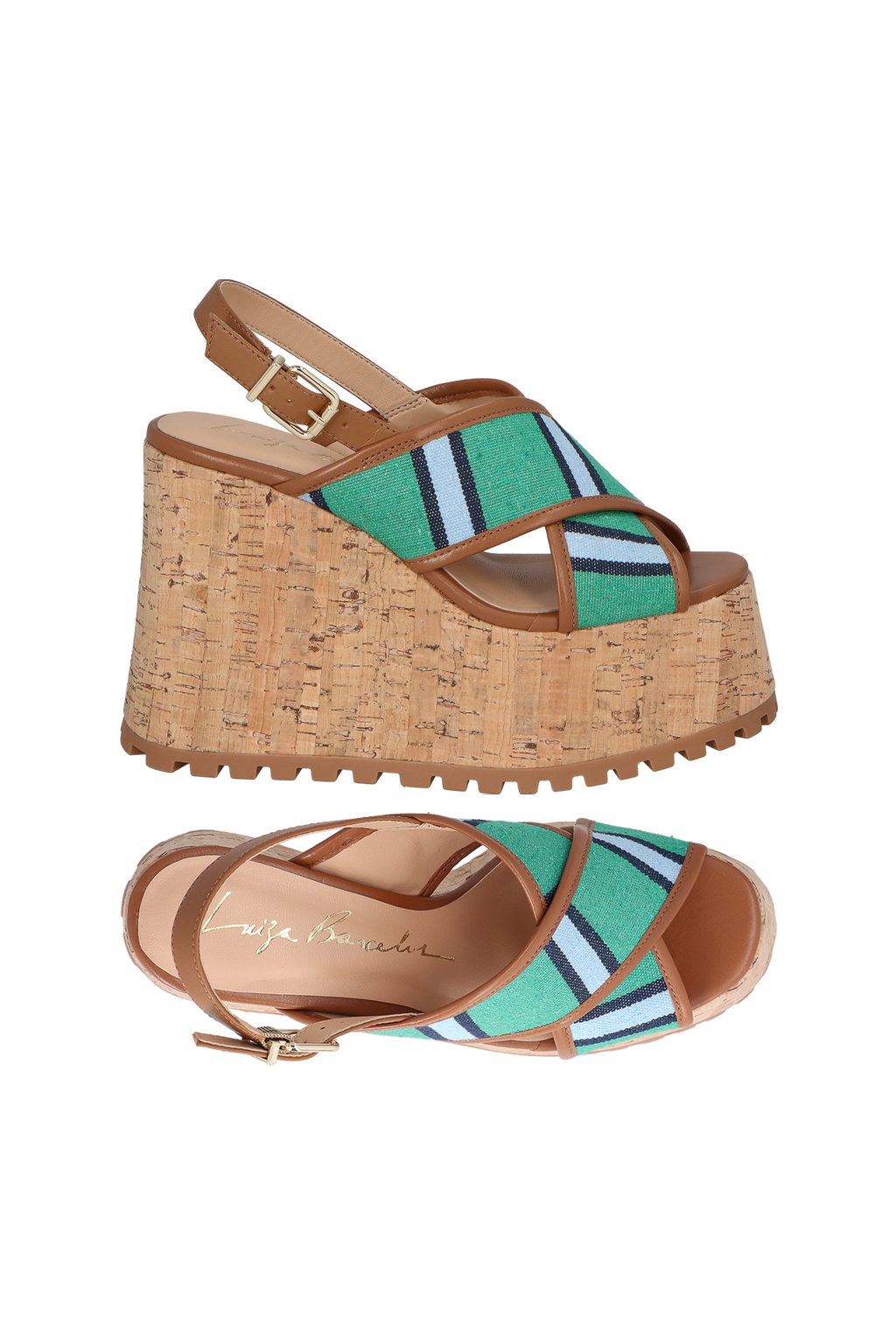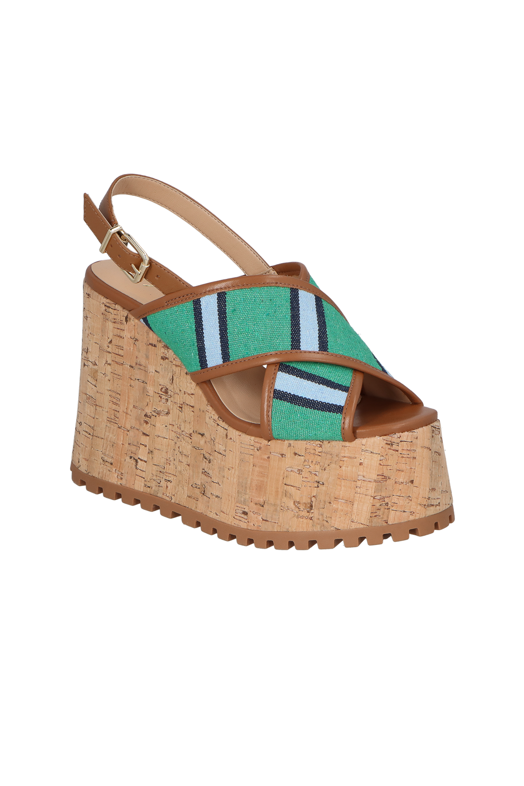 Com plataforma alta e revestida em cortiça, esta sandália une a leveza da listra e modernidade das tiras grossas e cruzadas na frente, produzidas em tecido listrado no tom verde, azul marinho e azul claro, com detalhe em couro no tom caramelo. O modelo possui sola tratorada, tira de couro caramelo com fivela para ajuste no tornozelo e bico arredondado.