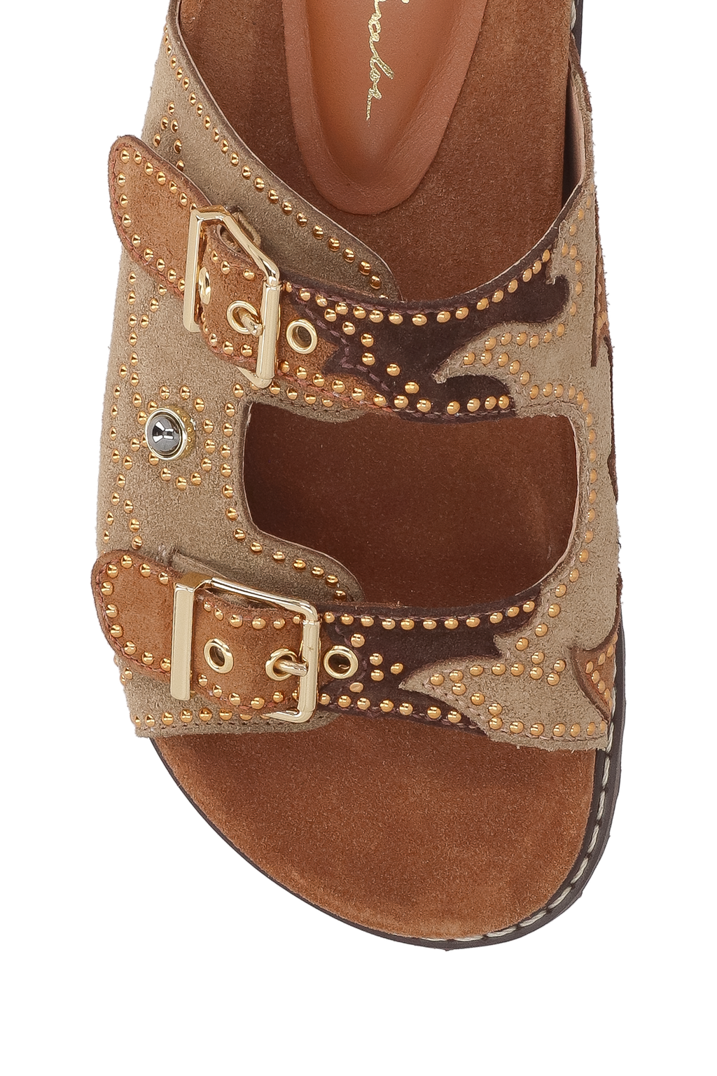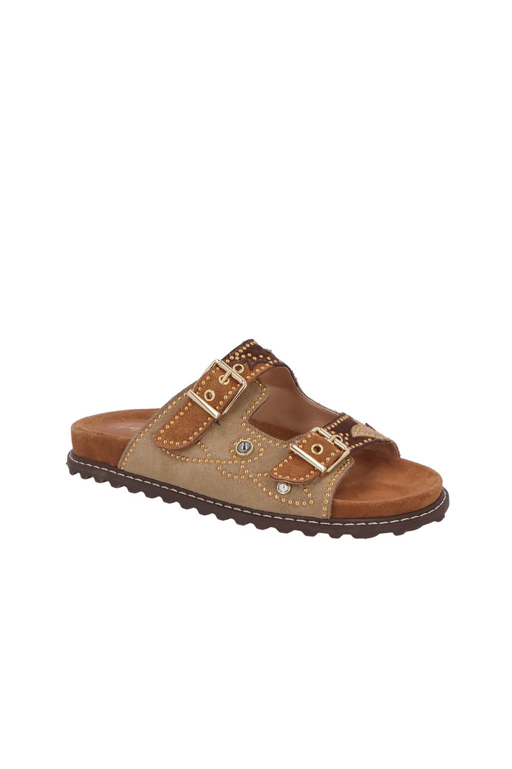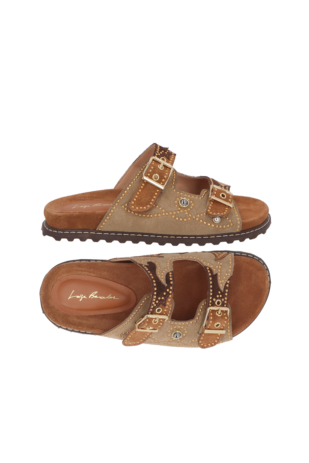 Em uma proposta moderna com inspiração utilitária, a papete em camurça no tom de bege fendi ganha destaque pelo visual robusto e cheio de estilo. O modelo apresenta tiras largas com fivelas ajustáveis, trabalhadas com aplicações de tachas em dourado e detalhes em caramelo e caiena que adicionam contraste e personalidade. Com solado tratorado e salto baixo, traduz conforto aliado à moda, resultando em um calçado versátil e contemporâneo.