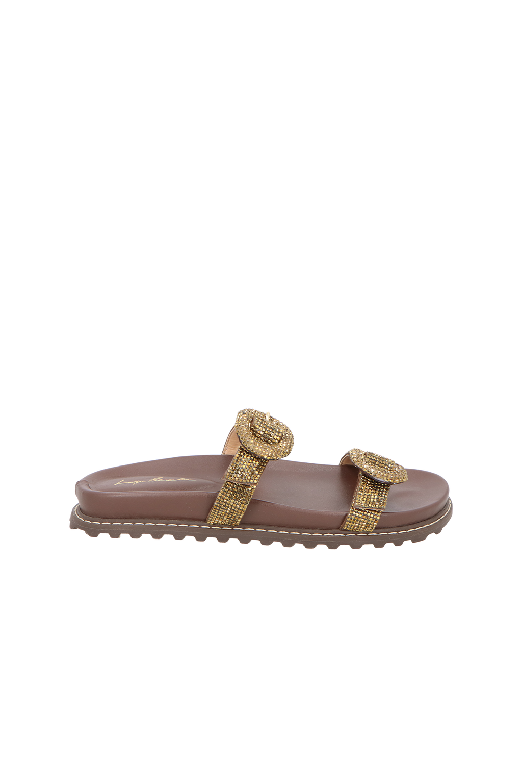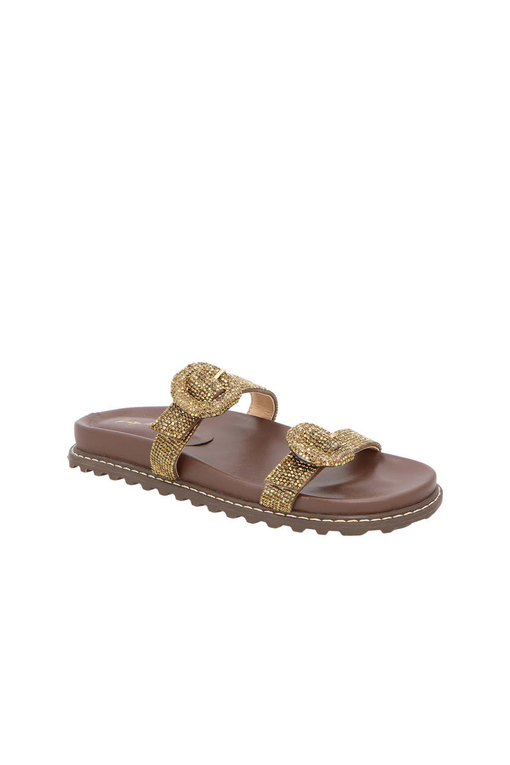 A papete em couro no tom de marrom café ganha um toque sofisticado com as tiras duplas adornadas por fivelas cobertas de strass, que adicionam brilho e modernidade ao design. O solado rasteiro e acabamento tratorado garante conforto e estilo em cada passo, equilibrando praticidade e sofisticação de forma única.