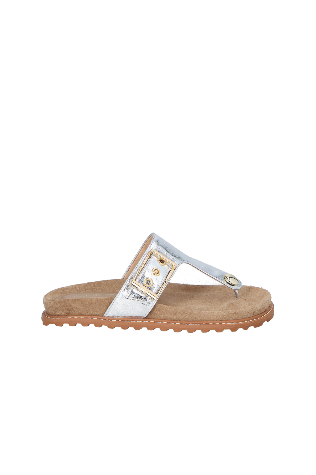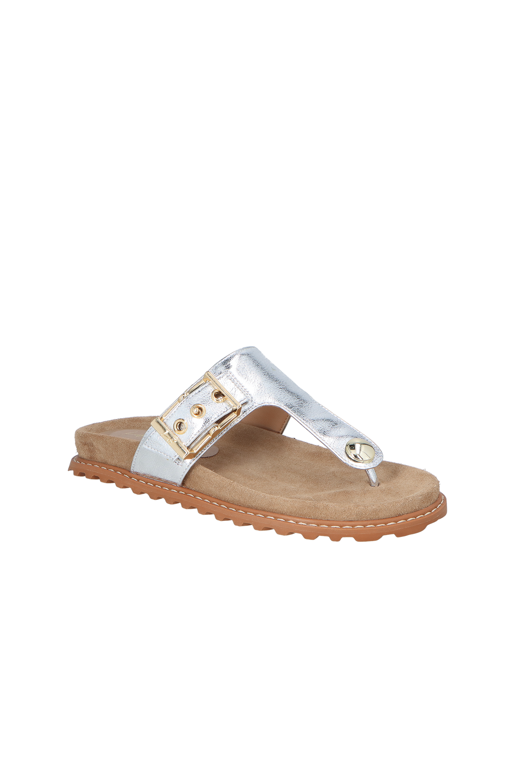 Um verdadeiro ícone de elegância e estilo. Com silhueta clássica de dedo, esta papete exala sofisticação e atenção aos detalhes, revelando um visual refinado e atemporal. Confeccionada em metalizado no tom prata com base em camurça fendi, o modelo apresenta maxi fivela metalizada que adiciona um toque de brilho e atitude, além de bico arredondado, palmilha anatômica e solado flatform tratorado