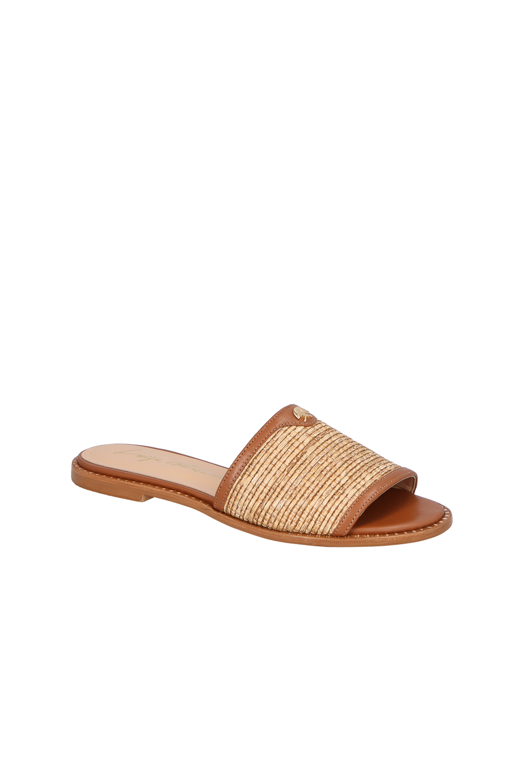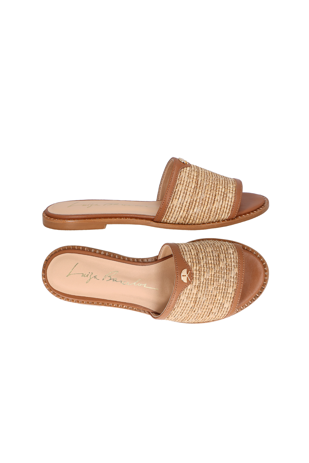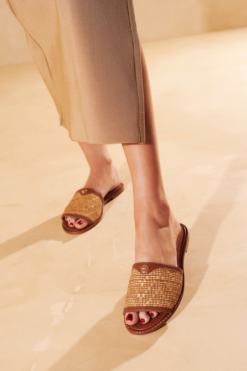 A rasteira em couro no tom de caramelo com detalhe em palha combina textura natural e acabamento sofisticado. O detalhe da caliandra de metal traz um toque moderno, criando um equilíbrio entre o rústico e o elegante. Um modelo versátil que traduz o frescor e a leveza da temporada.