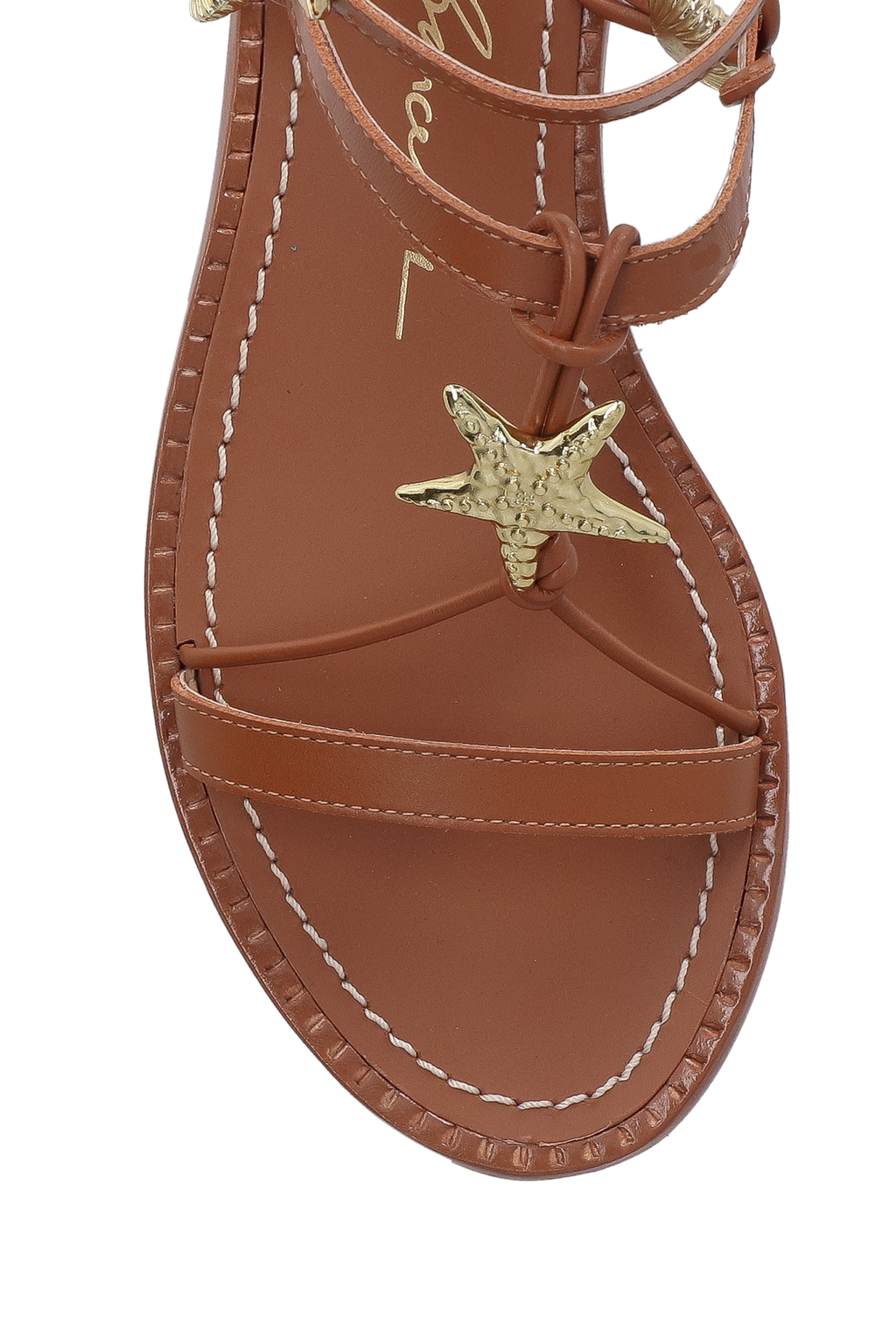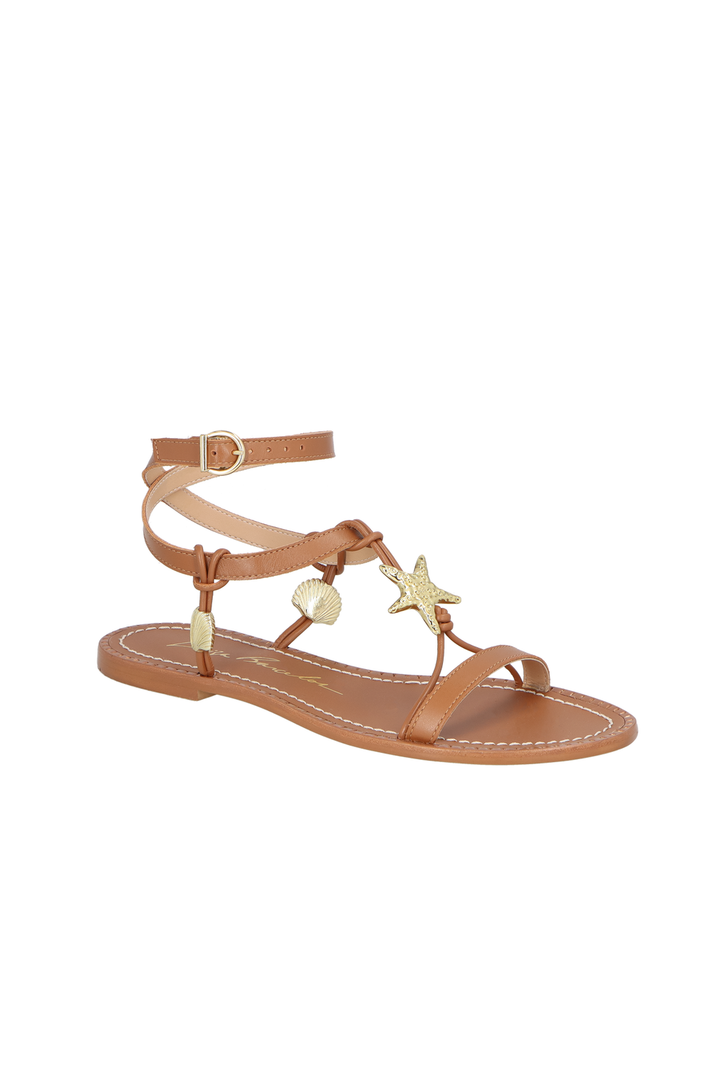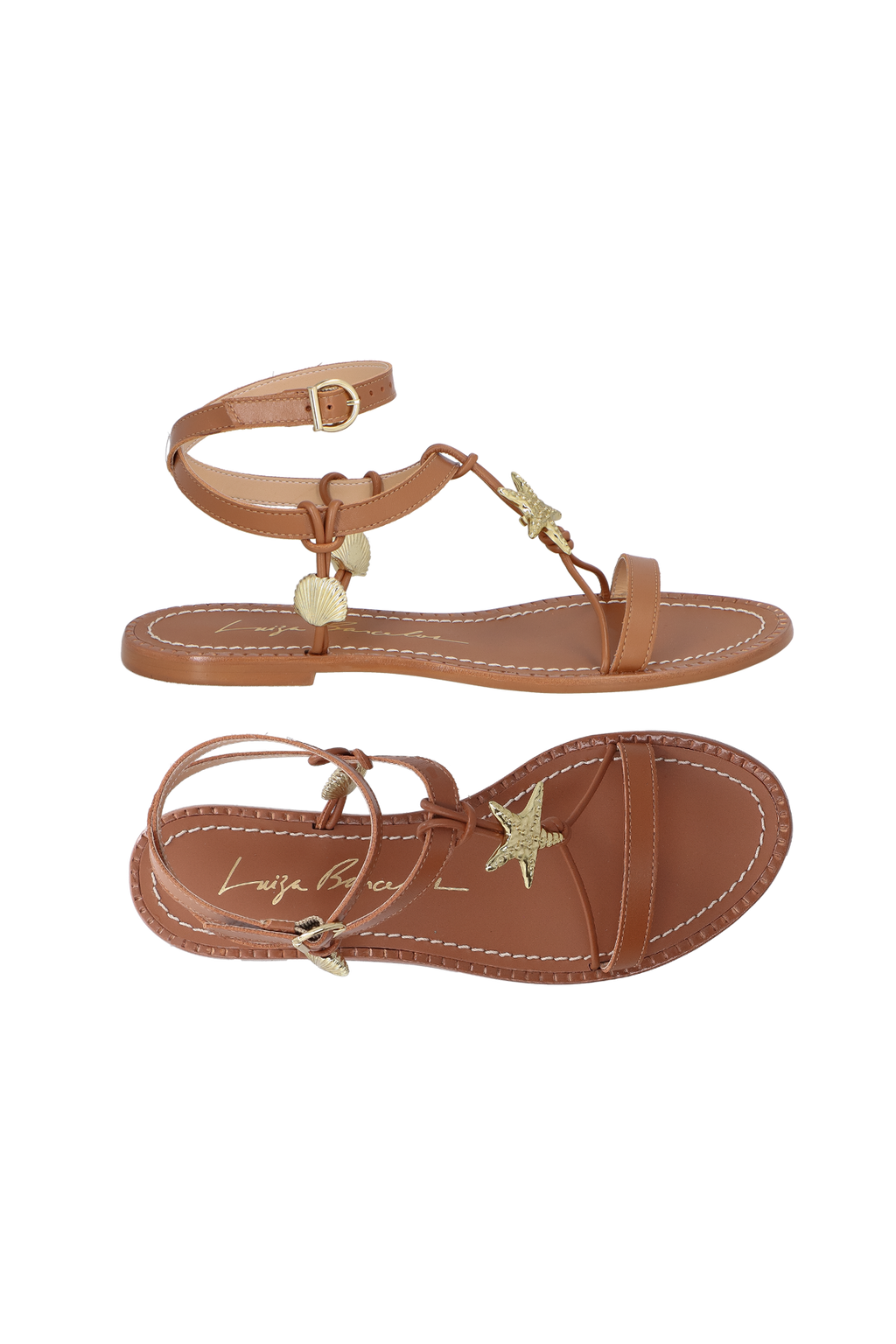 Inspirada no estilo leve do verão, a rasteira evoca a delicadeza e sofisticação para a estação mais quente do ano. Produzida em couro no tom caramelo, possui aviamento central em formato de estrela e duas conchas laterais, solado em couro com acabamento pespontado e fivela de ajuste no tornozelo.