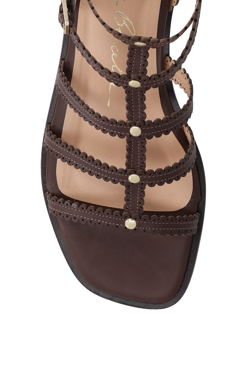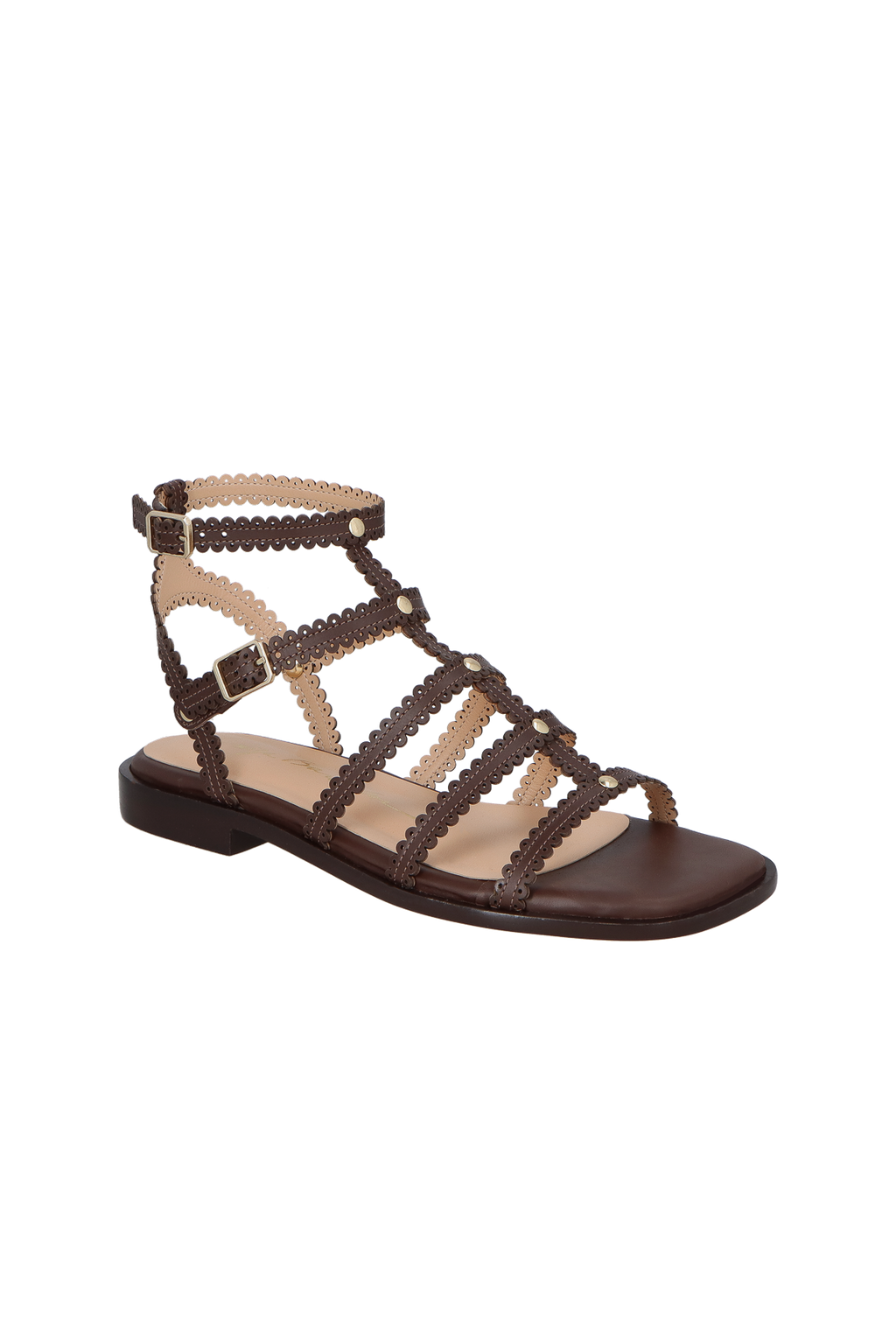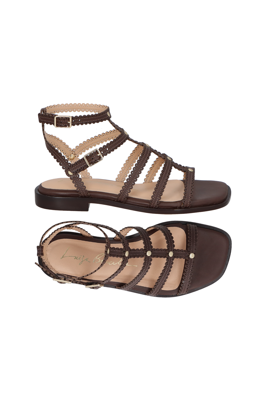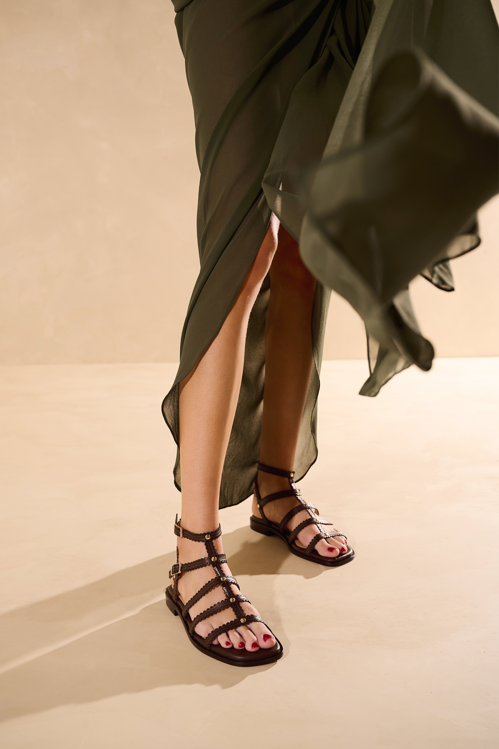 As clássicas sandálias gladiadoras ganham contornos modernos e românticos para o verão. O modelo, produzido em couro no tom marrom café, possui tiras centrais que se cruzam com um delicado recorte a laser, vira saliente, fechamento por fivela no tornozelo.
