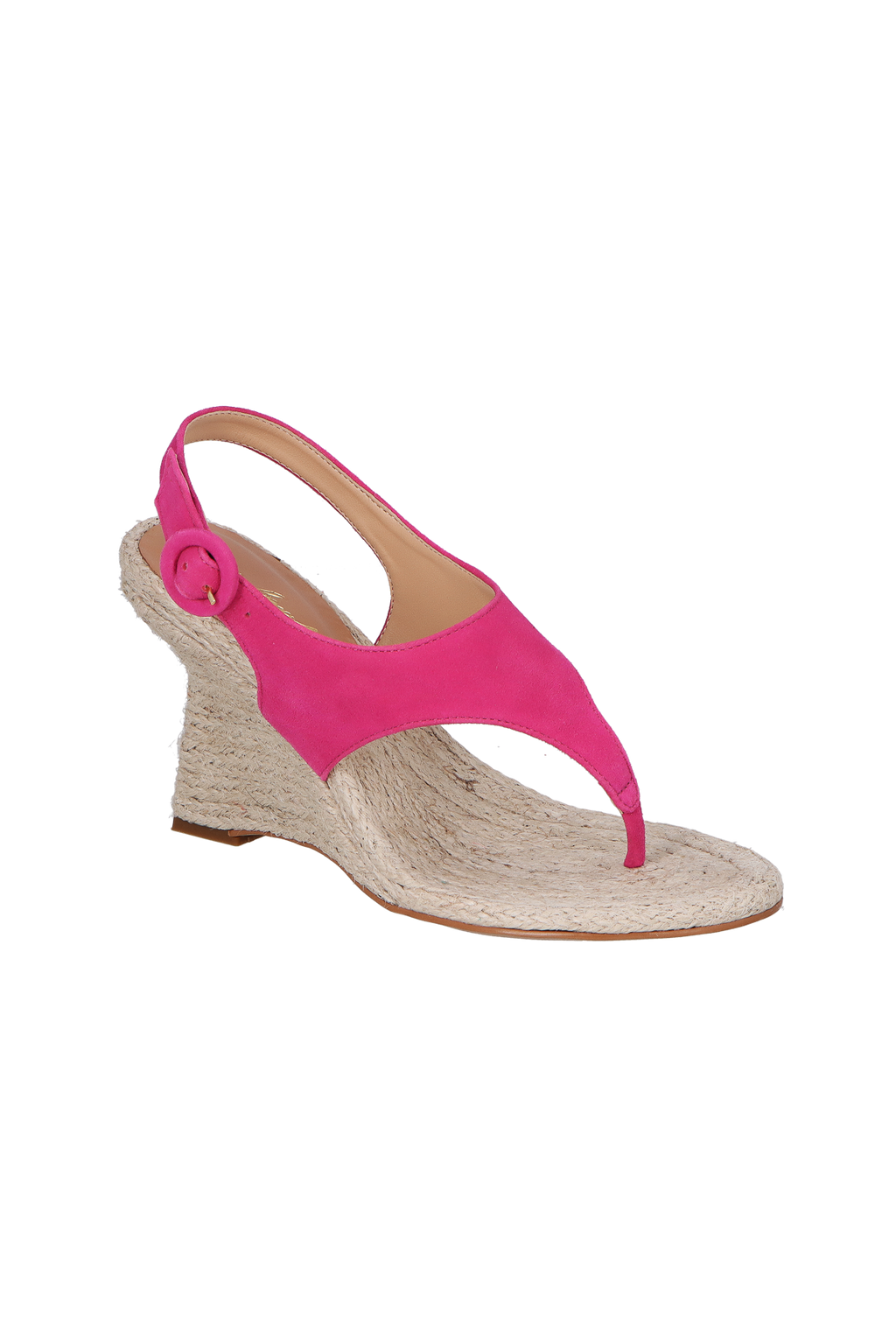 Com design marcante e estrutura imponente, esta sandália de dedo possui salto anabela de revestido em juta natural. A camurça rosa peonia adiciona leveza e modernidade ao visual, realçando produções com toque contemporâneo e personalidade. As tiras delicadas valorizam os pés, enquanto o fechamento no tornozelo e o salto anabela garantem conforto e estabilidade.