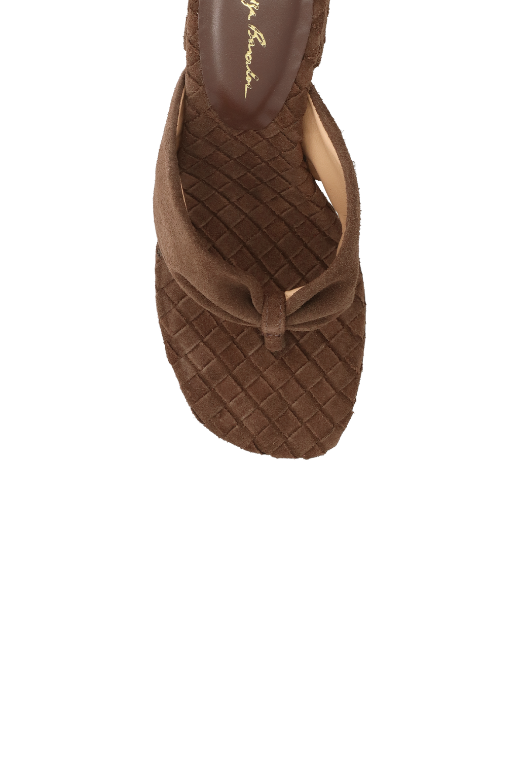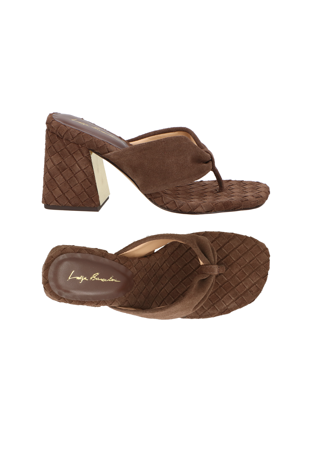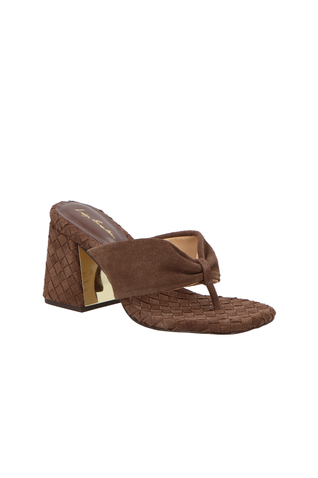 A sandália de dedo em camurça no tom de marrom café aposta em um visual sofisticado e cheio de personalidade. O modelo apresenta tiras largas que valorizam o pé com elegância, enquanto o salto bloco alto em tressê com detalhe espelhado garante destaque e modernidade. Uma peça que traduz estilo e conforto em um design marcante.