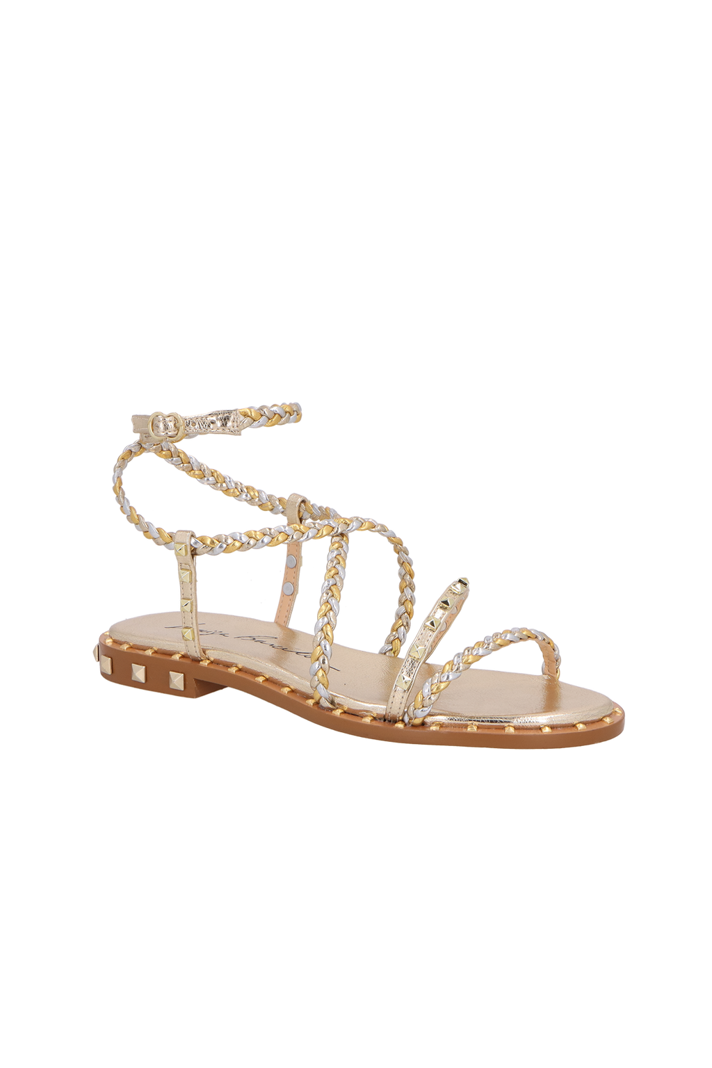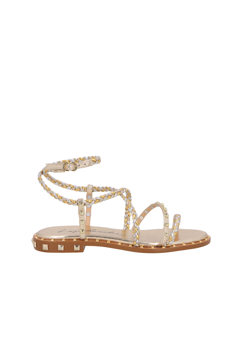 Essa rasteira combina tiras trançadas em material tecnológico nos tons de prata e ouro, criando um visual marcante e sofisticado. O mix de cores aliado ao acabamento com tachas no solado e nas tiras traz uma estética ousada e atual. A amarração no tornozelo finaliza a composição com charme e personalidade.