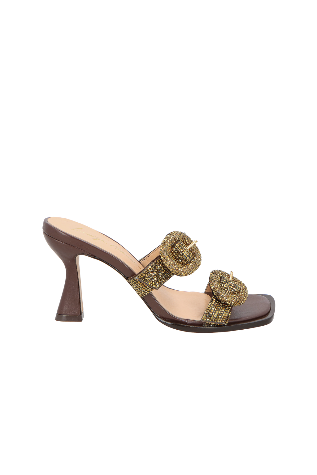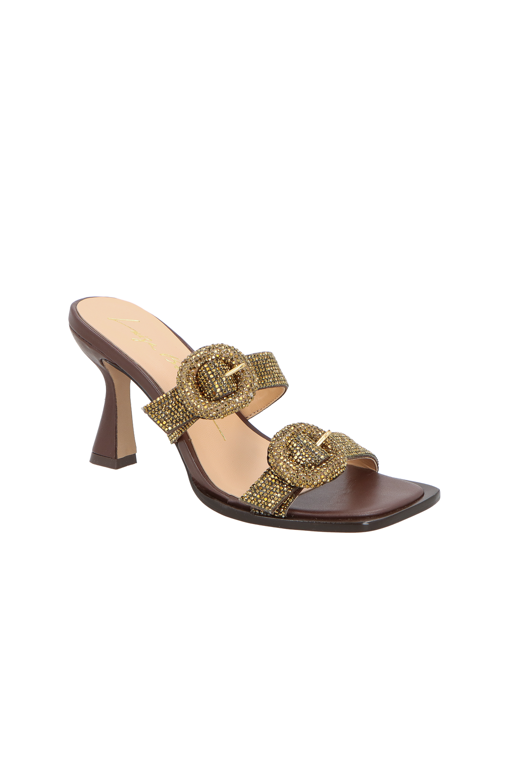 A sandália em couro no tom marrom café ganha um toque sofisticado com as tiras duplas adornadas por fivelas cobertas de strass, que adicionam brilho e modernidade ao design. Com salto alto arquitetônico. e vira saliente, ela é o equilíbrio perfeito entre o fashion e o glam.